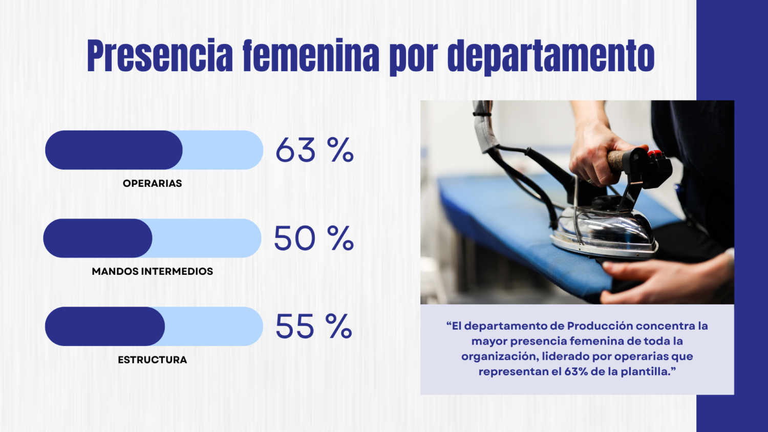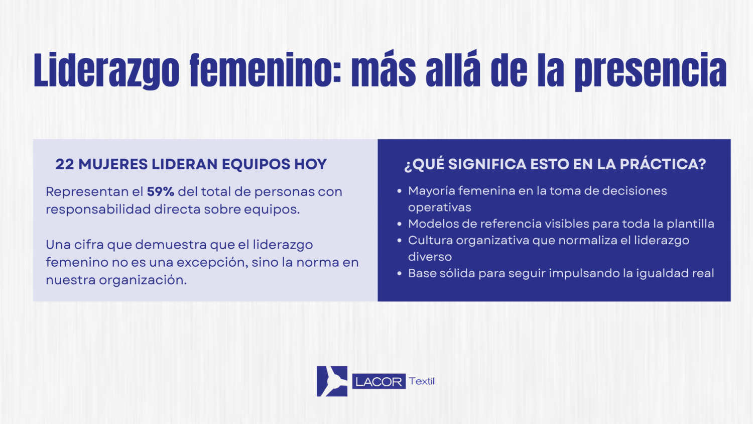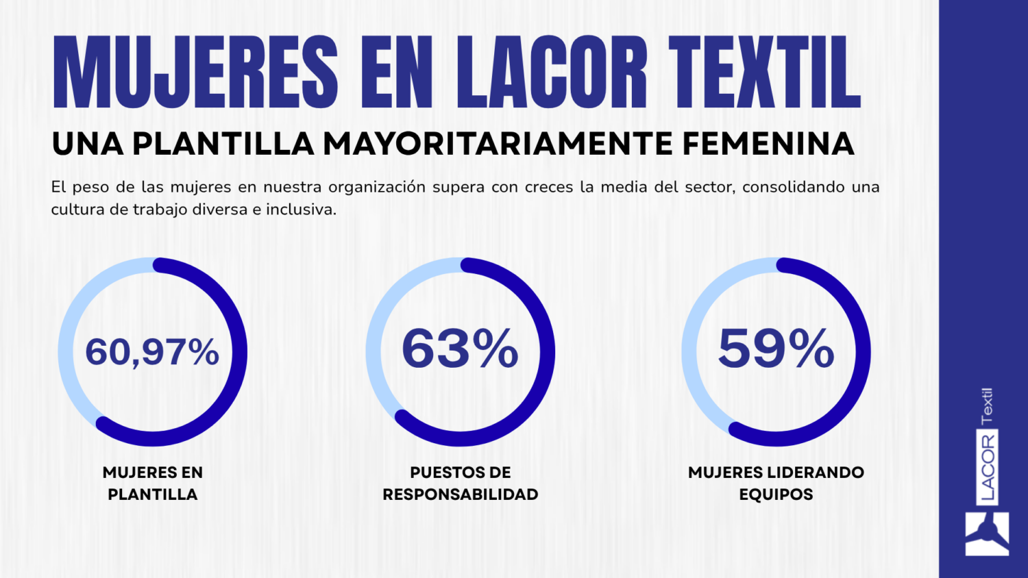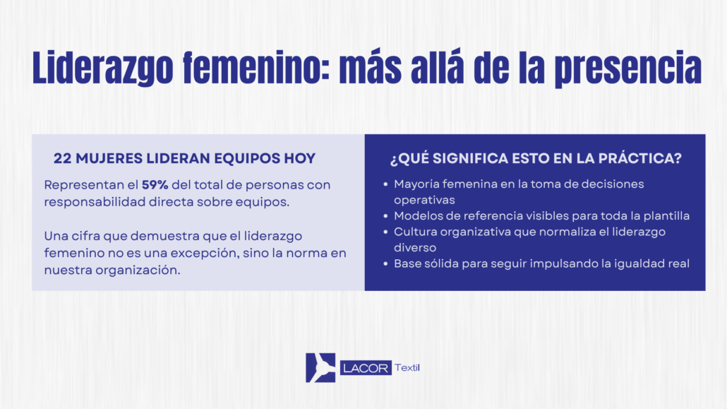 Este 8 de marzo en Lacor Textil hemos puesto en valor el papel esencial de las mujeres en nuestra organización. Hoy, más del 60,97% de nuestra plantilla son mujeres, el 63% de los puestos de responsabilidad están en manos femeninas y 22 mujeres lideran equipos, representando el 59% de los liderazgos de la compañía.